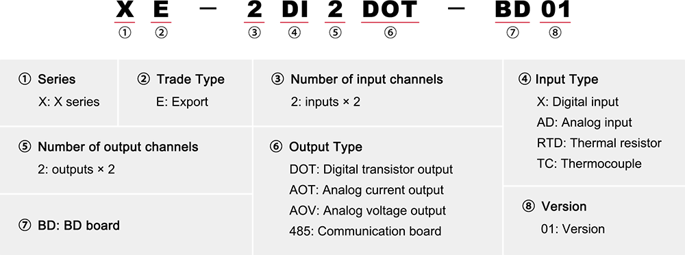 | 7 | XE-2AI1AO-BD01 | 2AI, 12bitový typ napětí; 1AO, 12bitový napěťový výstup/11bitový proudový výstup | analogové vstupy ×2, analogový výstup ×1 |
