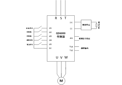 | 04 Úvod do systému: V tomto systému je vřeteno svislého soustruhu o výkonu 55 kW poháněno frekvenčním měničem RVE32 75 kW a rychlé zastavení brzdění je realizováno prostřednictvím externí brzdné jednotky a brzdného odporu. Řezání konstantní rychlostí je dosaženo pomocí vektorového řízení s otevřenou smyčkou a kolísání rychlosti způsobené změnami zatížení je velmi malé. Měnič se spouští přes ovládací terminál a daná rychlost je řízena analogovým napěťovým signálem 0-10V řídicího systému. Když motor běží při 70 Hz, kolísání rychlosti je menší než 1 ot./min a kolísání proudu je menší než 1A, což umožňuje přesné řízení rychlosti. | | ||||||||||||||||||